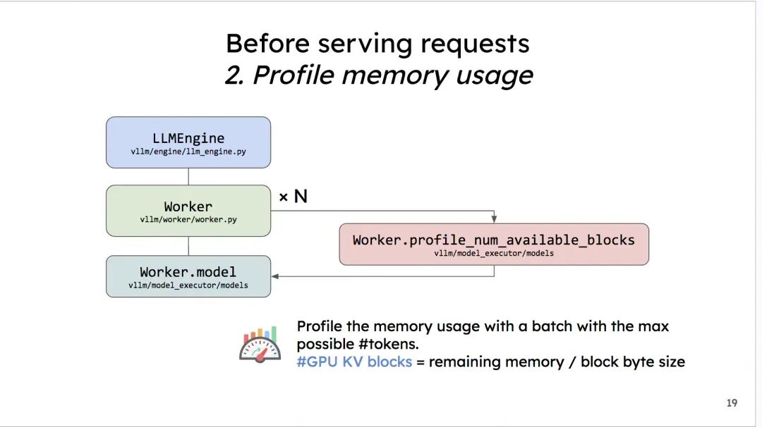 欸这个就非常有意思了。在模型部署的初始化阶段(推理正式开始前),vLLM会通过模拟实验的方式,来决定gpu/cpu上到底有多少个KV cache物理块可以分配给后续的请求们做推理。vLLM管这个步骤叫profile_num_available_blocks。我们来看看这个模拟实验是怎么做的: