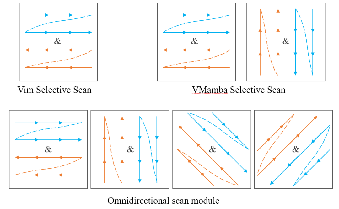 Vim, VMamba和OSSM的选择性扫描方向如下图所示,Vim的选择性扫描方向是图像的横向,即从左到右扫描和从右到左扫描;VMamba的选择性扫描方向是图像的横向和纵向,即从左到右和从右到左,加上从上到下和从下到上扫描。