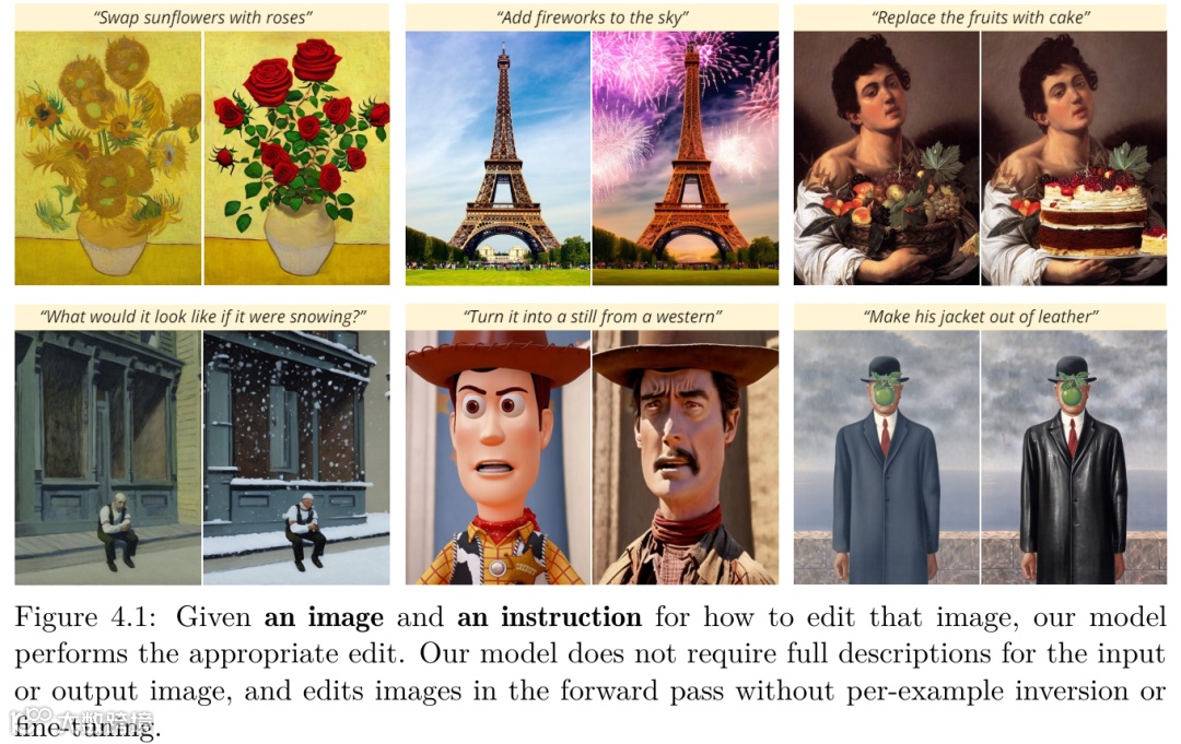 使用生成的配对数据,Tim Brooks 训练了一个条件扩散模型,该模型在给定输入图像和有关如何编辑文本指令的情况下,生成编辑后的图像。该模型可以直接在前向传播中执行图像编辑,不需要任何其他示例图像、输入 / 输出图像的完整描述或每个示例的微调。尽管模型完全在合成示例上进行训练,但其实现了对任意真实图像和人类指令的零样本泛化。该模型可以按照人类指令执行各种编辑:替换对象、更改图像样式、更改设置、艺术媒介等。