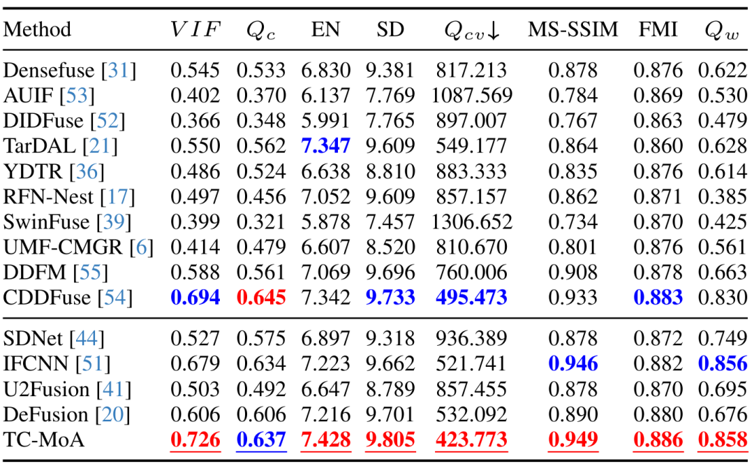大量的实验验证了我们在通用图像融合方面的优越性,包括多模态、多曝光和多焦点融合。更重要的是,我们的 TC-MoA 甚至对未知的融合任务显示出了创造性的可控性和泛化性,充分展示了我们在更广泛的融合场景中的潜力。