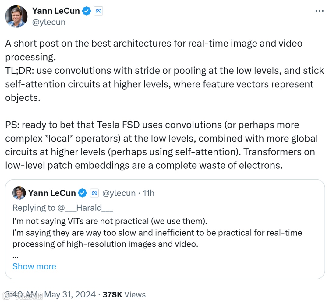 近日,一直在社交媒体上活跃的图灵奖得主、Meta 首席科学家 Yann LeCun 也加入了 ViT 与 CNN 之争的讨论。