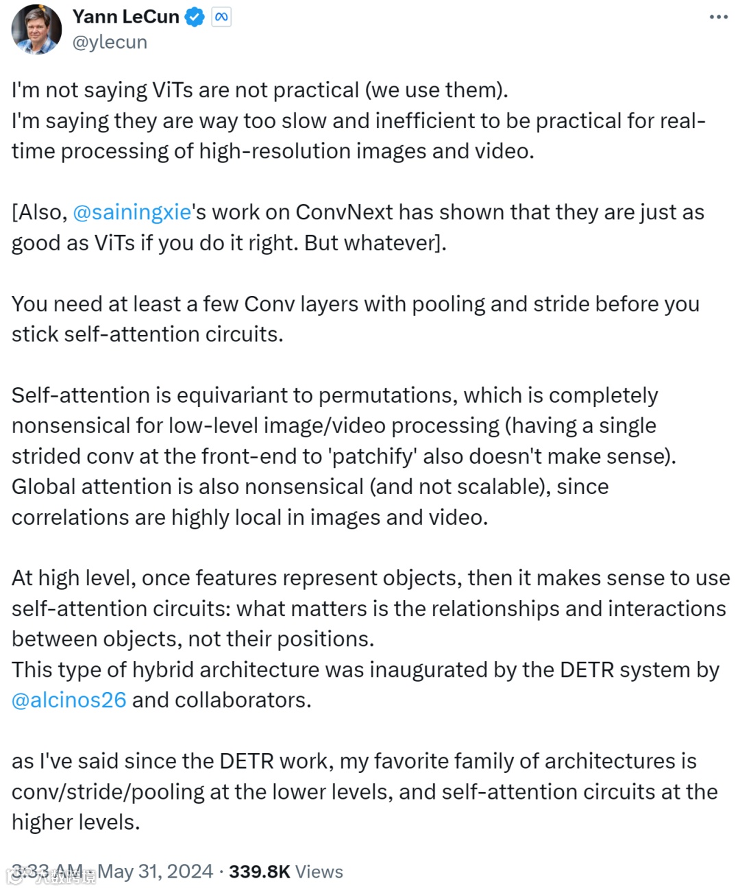 Yann LeCun 在第二个帖子里总结到:在低级别使用带有步幅或池化的卷积,在高级别使用自注意力循环,并使用特征向量来表征对象。