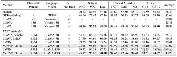 我们还在CLIP-ViT-L和LLaMA上使用ScienceQA数据集进行实验。我们的方法显著优于现有的其他方法,如LLaMA-Adapter,LLaVA-LoRA,LaVIN等。