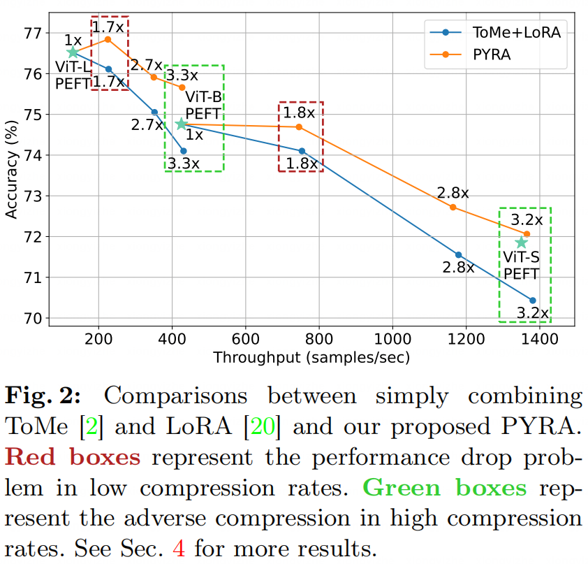 我们将这一挑战称为训练-推理高效任务适应(Training-Inference Efficient Task Adaptation)。探索这个问题可以使我们方便地以最小的成本部署先进的大规模基础模型到现实世界的下游应用中,这对于基础模型的广泛实现是极为必要的。一个直接的解决方案是结合PEFT和模型压缩。然而,对于高效的任务适应,一个完整的重新训练(Re-Training)阶段是不可承受的。因此,简单地结合PEFT和模型压缩容易遭受显著性能下降。例如,我们可以将常用且高效的LoRA [5],与ToMe [7],一个针对视觉transformers的无参数模型压缩技术结合起来(实际上,ToMe+LoRA是一个简洁而极为强大的解决方案,这一点在实验部分有所说明)。如图2所示,在较低的压缩率(大约1.7)下,两个Transformer骨干(ViT-L/16和ViT-B/16)的性能相较于直接在做PEFT,表现出轻微下降(<1%),这表明尽管方案需要进一步的性能改进,但ToMe+LoRA组合在较低压缩率范围内可以作为一个基础解决方案。在高压缩率(>3.0)下,ToMe+LoRA的性能迅速下降,其性能甚至不如直接对相应吞吐量的小规模Transformer进行直接PEFT。我们将这种现象称为逆压缩。这两种现象表明,直接结合现有工作无法有效应对新挑战。