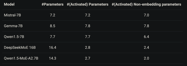 虽然Qwen1.5-MoE-A2.7B总参数量较大,但激活的non-embedding参数量远小于7B模型,如下表所示