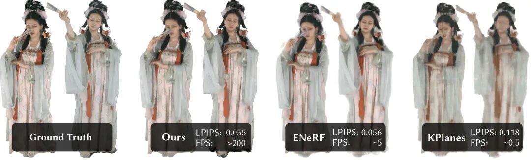 ENeRF-Outdoor: 这个数据集在室外环境中使用 1080p 相机以 30FPS 记录了多个动态人物和物体。选择了三个包含 6 个不同演员(每个序列选择了 2 个演员)的 100 帧序列来评估本文的方法 4K4D。这个数据集对于动态视角合成具有挑战性,因为同一个片段中不仅有多个移动的人物和物体,而且由于人物的阴影,背景也是动态的。