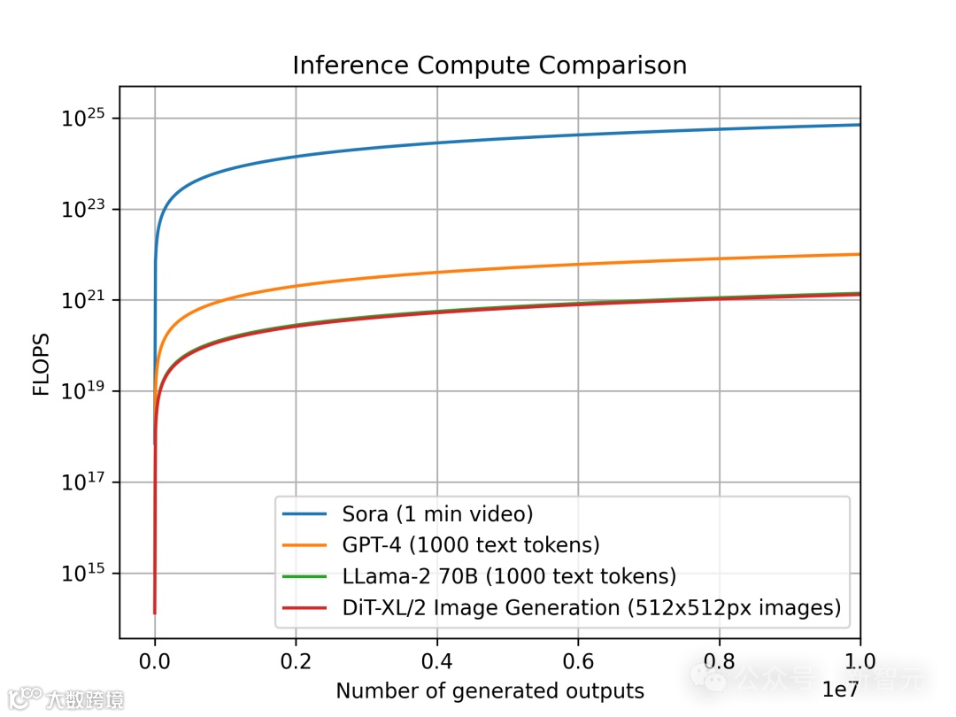 基于DiT到Sora的推算,Sora每生成一段视频的计算成本约为708×10^15 FLOPS,相当于每个H100 GPU大约能每小时生成5分钟视频。