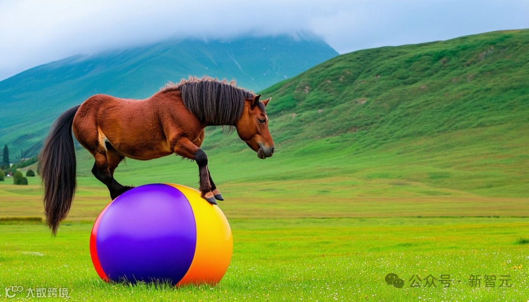 Prompt: A horse balancing on top of a colorful ball in a field with green grass and a mountain in the background. 提示(意译版):一匹马优雅地站在一个五彩斑斓的球上,周围是一片生机勃勃的绿色草地。远处,一座雄伟的山峦巍峨地矗立。