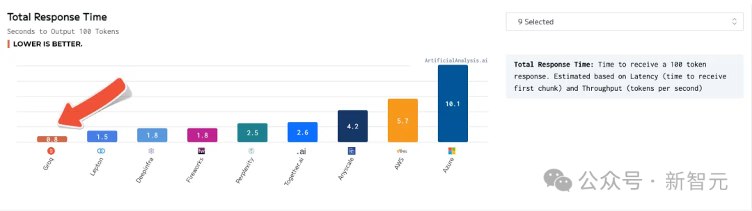 Groq的响应时间也是最少的,接收100个token后输出只有0.8秒。