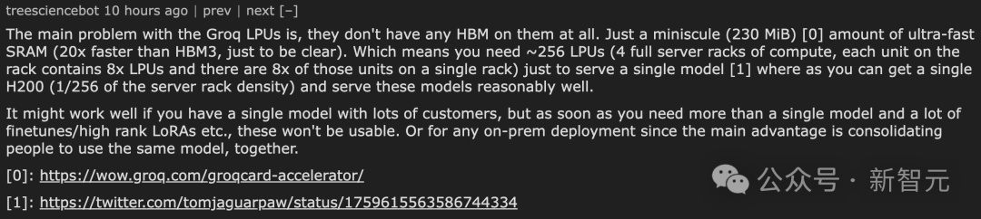 对此网友表示,Groq LPU面临的一个关键问题是,它们完全不配备高带宽存储器(HBM),而是仅配备了一小块(230MiB)的超高速静态随机存取存储器(SRAM),这种SRAM的速度比HBM3快20倍。