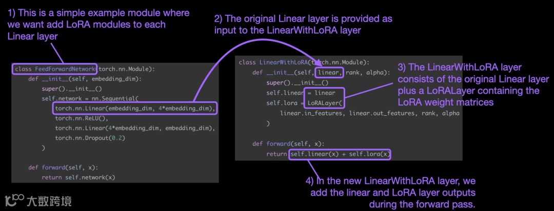 如果你想通过修改现有 PyTorch 模型来实现 LoRA ,一种简单方法是将每个线性层替换为 LinearWithLoRA 层: