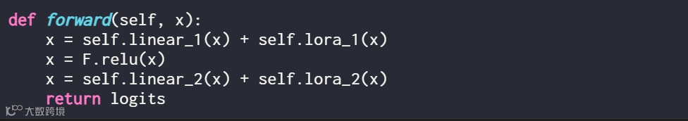 在使用 LoRA 时,通常会将 LoRA 更新添加到这些线性层的输出中,又得到代码如下: