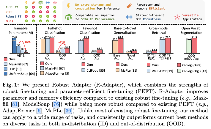 最近,针对这些挑战提出了几种微调方法。稳健微调的目标是在微调零样本模型的同时保持对OOD的鲁棒性,而参数高效微调(PEFT)仅更新一小部分参数,同时保持预训练参数的冻结状态。然而,每种方法只解决其中一个挑战,同时在另一个挑战上仍然存在不足。如图1所示,现有的稳健微调方法仍然需要微调整个模型,导致训练代价高昂。此外,它们仅针对分类任务,因此通常仅训练图像编码器,从模型中排除了零样本推断能力。另一方面,与稳健微调相比,PEFT在分布偏移下的性能显著滞后。它们的关键缺点凸显了需要新的微调方法,同时解决稳健微调和PEFT分别应对的两个挑战。