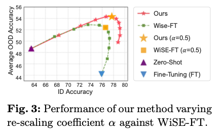 这里, 表示集成的权重, 是一个重调整系数。系数 充当插值因子, 调整原始预训练权重 与微调层调整权重之间的平衡。这种技术不仅可以提高在分布转移下的准确性, 也能在 ID 数据上保持高性能。关键是, 与 WiSE-FT 不同, 该方法不需要在存储中维护两个单独的完整模型,因此更有效地促进了更节省存储空间的权重空间集成。