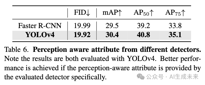 检测器。 探讨了两种广泛认可的检测器[1,39],用于在省略使用P.A.损失的情况下获取P.A. Attr。表6展示了检测器选择对P.A. Attr质量的显著影响,YOLOv4在这方面表现出色。因此,YOLOv4作为保真度的主要检测器,而Faster R-CNN则用于可训练性,因为它是训练后下游检测器的角色。