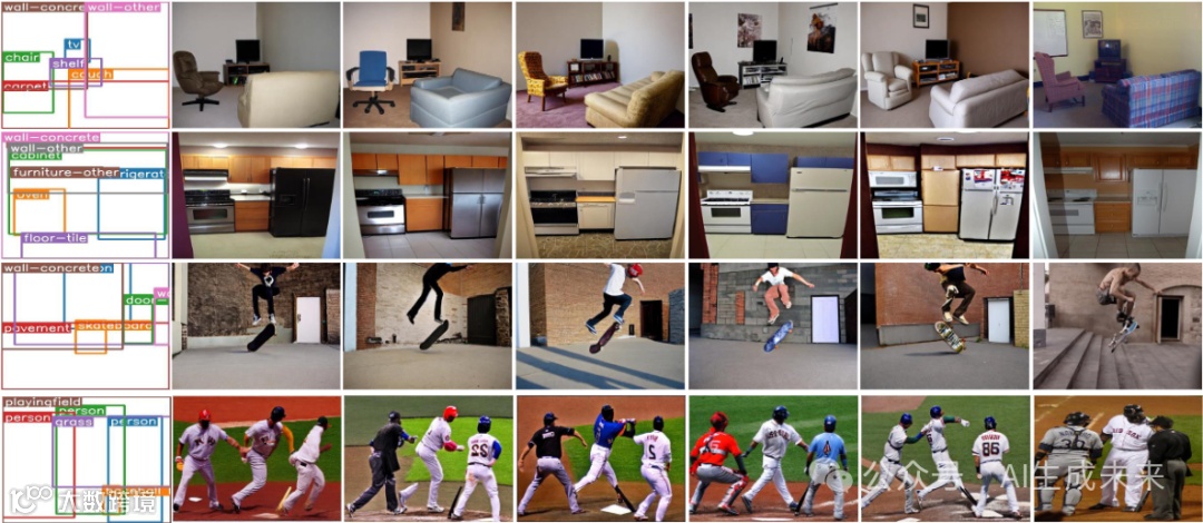 保真度。 下图4展示了验证我们模型在图像生成中的忠实度和准确性的示例。LayoutDiffusion的混乱结果源于其额外的控制模块与扩散过程的冲突。依赖高质量字幕的ReCo经常遭受质量降低和遗漏细节的困扰。GLlGEN和ControlNet,尽管输出质量很高,但缺乏精确的目标监督,导致细节不足和目标数量不稳定。我们对P.A.损失和P.A.属性的实现增强了目标质量,确保了一致的数量和受控的生成,如与P.A.属性对齐的生成目标数量所反映的那样。