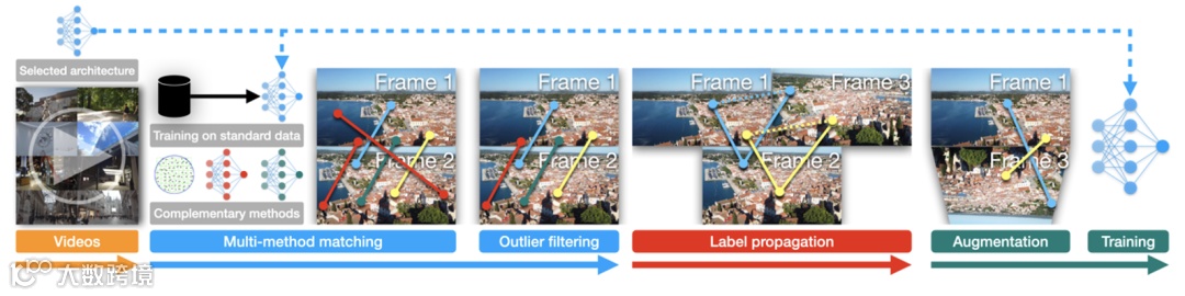 第二步,用标准训练数据(非互联网视频,如MegaDepth)训练匹配模型,然后再收集其他补充的匹配方法,用所有这些方法在互联网视频上的短距离间隔的帧上进行匹配,获取较为密集的匹配结果。然后用outlier filtering过滤一遍匹配。