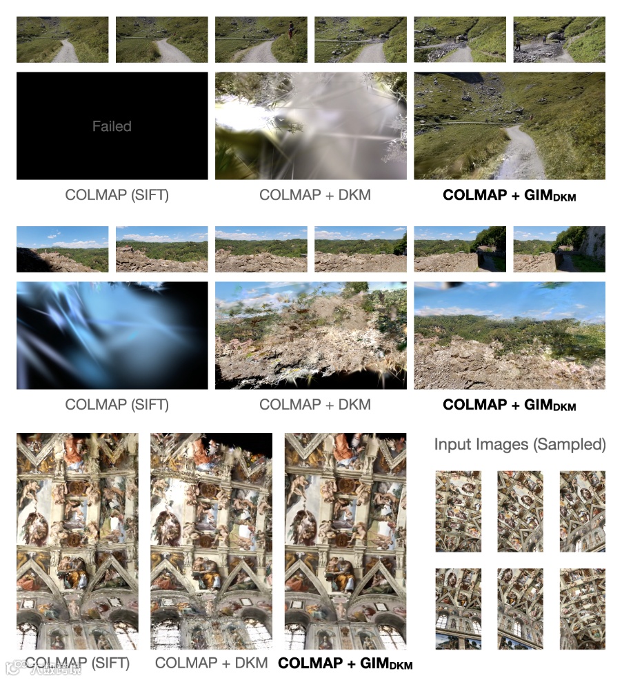 由于GIM能够很有效地提升COLMAP多视角重建的质量,在对应的下游任务中GIM也能够有很好的帮助,下面几张图展示了用GIM的COLMAP结果来初始化Gaussian Splatting的效果。可以看到在有挑战性的场景中,基于SIFT和DKM的COLMAP都不能够很好地提供有效的initialization,导致渲染效果不佳。