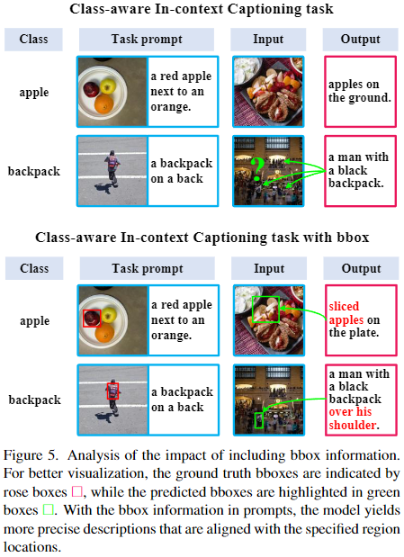 对描述任务,我们从密集字幕和视觉定位任务中汲取灵感,分析提供对象位置信息是否有利于模型捕获上下文样本传达的语义线索。我们尝试了两种不同的边界框定义。第一种方法要求模型将目标对象的 bbox 输出为二进制掩码,其中 0 表示目标,1 表示背景。第二种方法将 bbox 信息直接集成到标题中。实验表明采用文本编码的方式更有利于模型关注到指定的区域,并且可以大大减小输入序列的长度。
