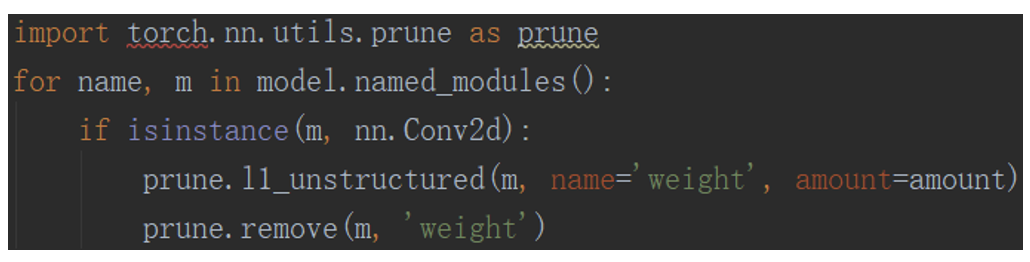 我们采用pytorch自带的稀疏剪枝,因子设置为0.3。代码如下: