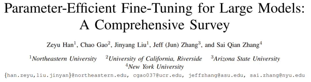 为了全面总结 PEFT 技术的发展历程并及时跟进最新的研究进展,最近,来自美国东北大学、加州大学 Riverside 分校、亚利桑那州立大学和纽约大学研究者们调研、整理并总结了参数高效微调(PEFT)技术在大模型上的应用及其发展前景,并总结为一篇全面且前沿的综述。