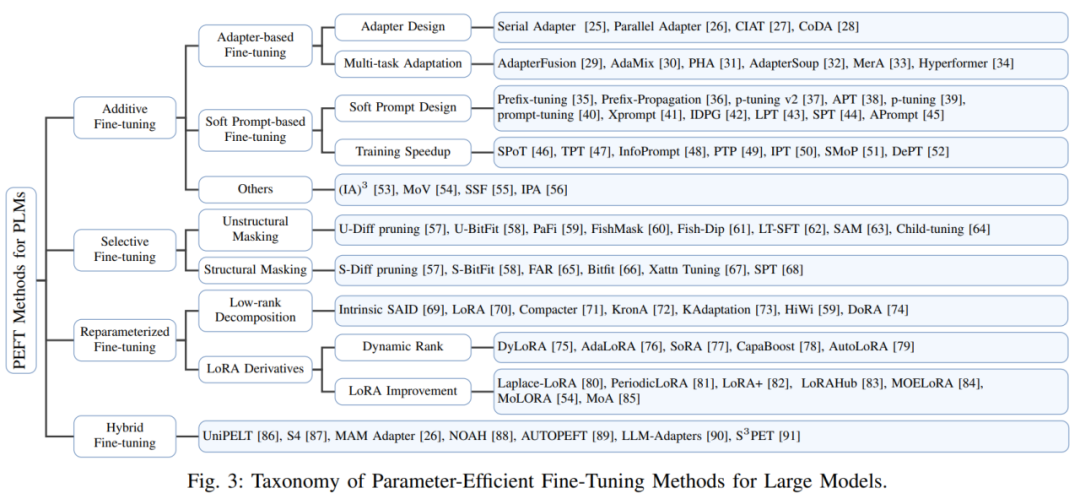 此外,作者还概述了 PEFT 算法的分类方法。作者根据不同的操作将 PEFT 算法划分为加性微调、选择性微调、重参数化微调和混合微调。图三展示了 PEFT 算法的分类及各分类下包含的具体算法名称。各分类的具体定义将在后文详细讲解。