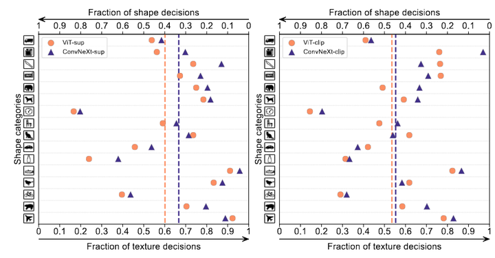 本文的结果如图4所示,虚线表示所有类别的平均形状偏差。横轴代表形状和纹理分数,纵轴代表不同的类别。