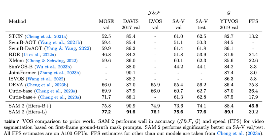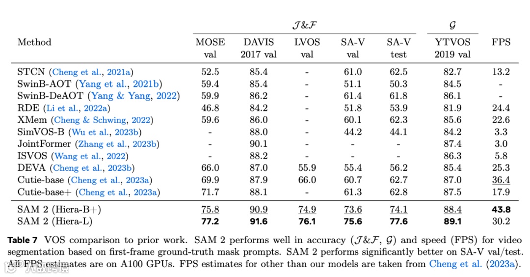 3、与之前的最先进模型相比,SAM 2 在现有的视频对象分割基准(DAVIS、MOSE、LVOS、YouTube-VOS)上表现出色。