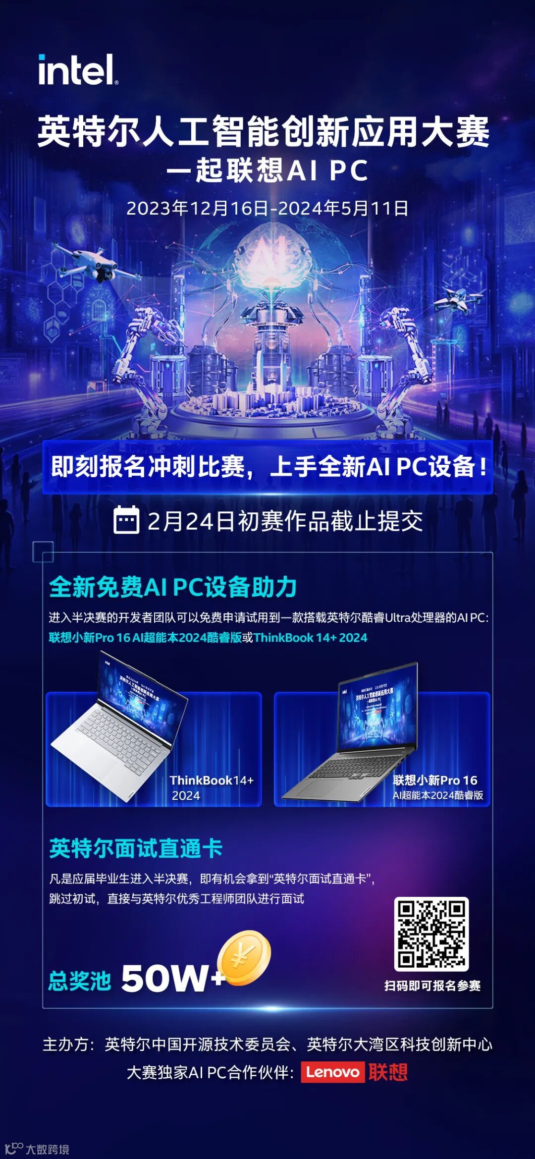 英特尔人工智能创新应用大赛为进入半决赛的开发者团队送上联想小新Pro 16 AI超能本2024酷睿版或ThinkBook 14+ 2024新装备。只要在英特尔人工智能创新应用大赛中闯进半决赛,选手就可以免费申请到一款全新AI PC,在大赛期间基于装备继续开发和部署作品,设备试用期全程免费。全新一代AI PC在手,将为参赛选手带来更多助力,高效探索AI应用,尽情施展创新构想。