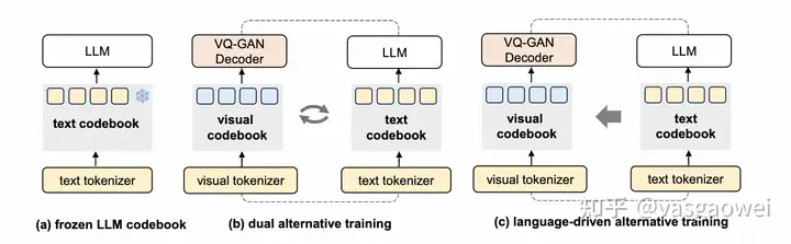 在第一种方式中,visual tokenizer的codebook用LLM的codebook进行初始化;在第二种方式中对visual tokenizer和text tokenizer进行交替训练,不过codebook都是用的同一个;在第三种方式中,用到了语言驱动的迭代式训练方法,具体来说就是用到了指数移动平均的方法更新visual codebook,