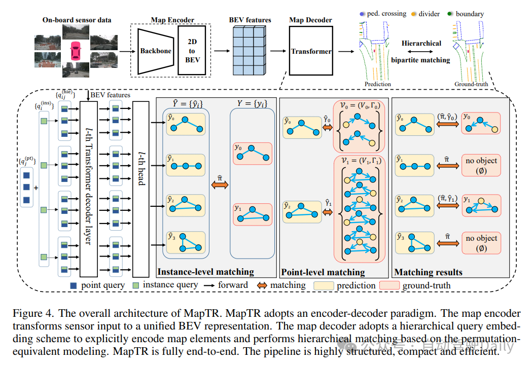 这样,真值可以表示成 个地图元素的集合,每个元素 表示该元素的类别。预测的元素 ,其中 和 分别是预测的分类置信度和预测点集。为了实现结构化的地图元素建模和学习,MapTR 引入了层次双分图匹配 (hierarchical bipartite matching),即按顺序进行实例级别的匹配和点级别的匹配。