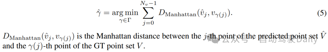 在这之后,每个预测的地图元素 都会被分配给一个真值 ,对于每个被分配正标签(类别标签不为空)的预测元素,开始进行点级别匹配,以找到预测点集 和真值点集 之间的最优点对点分配 。