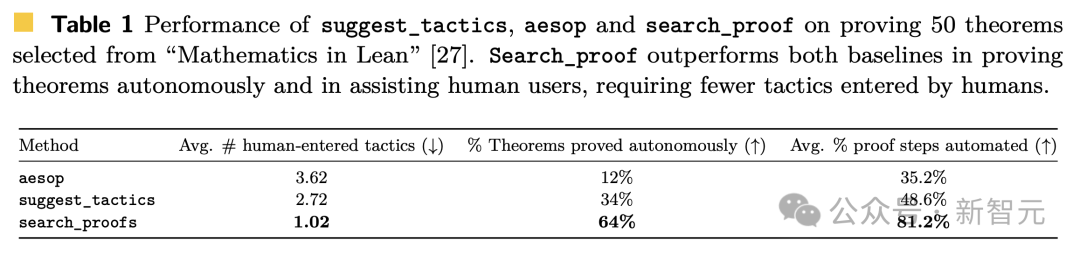 实验结果也充分表明了,跟Lean中现有的基于规则的证明自动化相比,Lean Copilot在辅助人类自动化定理证明上,是有效的。