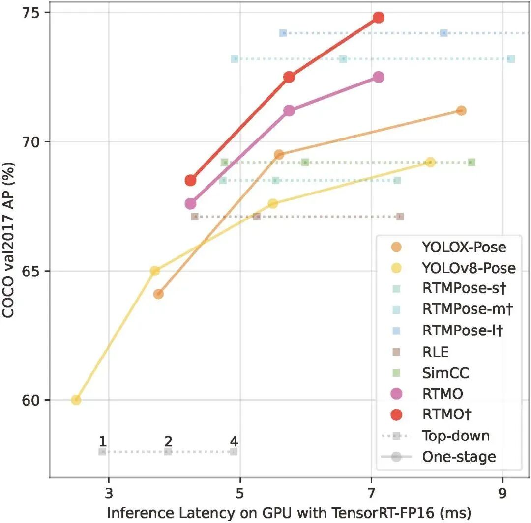 相较其他实时单阶段模型,RTMO 在性能上全面领先,达到了和二阶段模型 RTMPose 差不多的精度。而相比二阶段模型,RTMO 在画面中人数较多时有速度优势。在相同精度要求下,当画面中人数超过 4(cpu)/2(gpu) 时,RTMO 的推理速度就已经超越了 RTMPose。