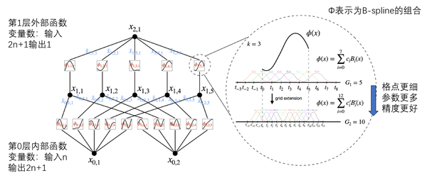 其中Φ l是第l个KAN层所对应的函数矩阵(B-spline函数矩阵),x为输入矩阵。