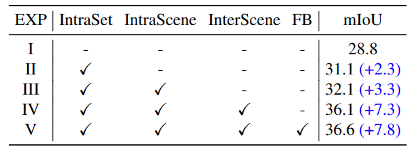 为了探究本文各个模块的贡献,我们在表2中提供了在ScanNet数据集上的消融实验结果。从基线模型开始,逐步增加集合内相关性学习、场景内相关性学习、场景间相关性学习模块,以及反馈机制,每一步的增加都带来了显著的性能提升。
