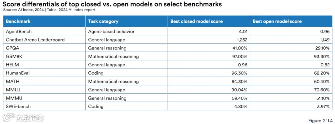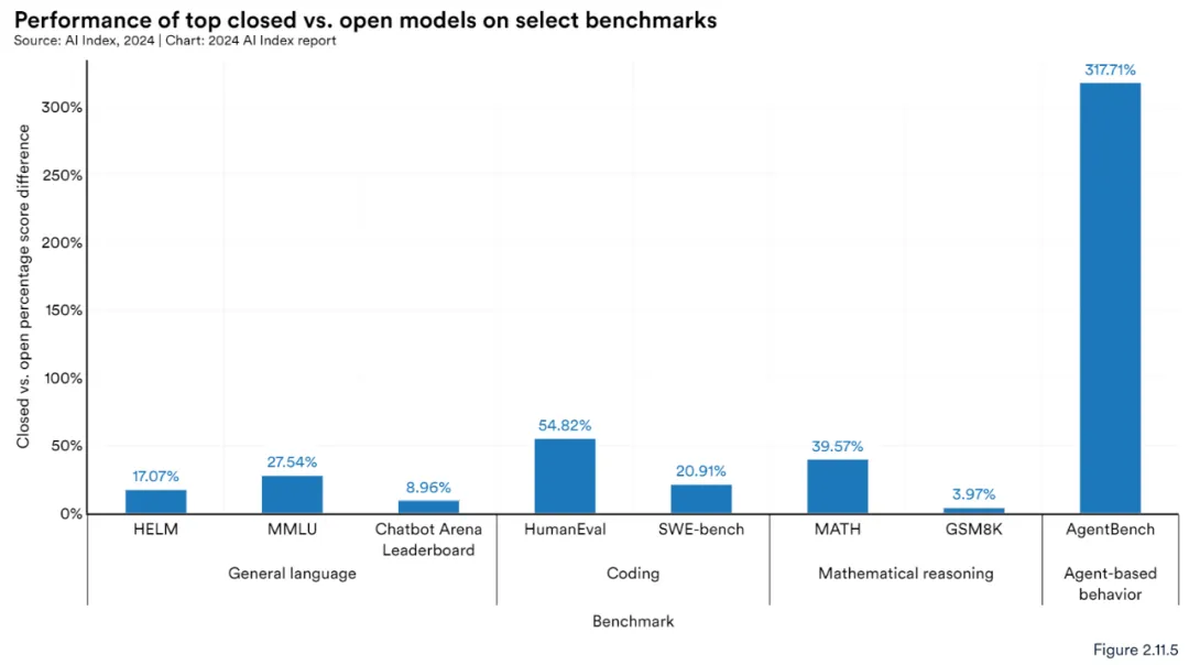 图 2.11.4 和 2.11.5 将闭源模型与开源模型在选定的基准上进行了对比。在所有选定的基准上,闭源模型的表现均优于开源模型。
