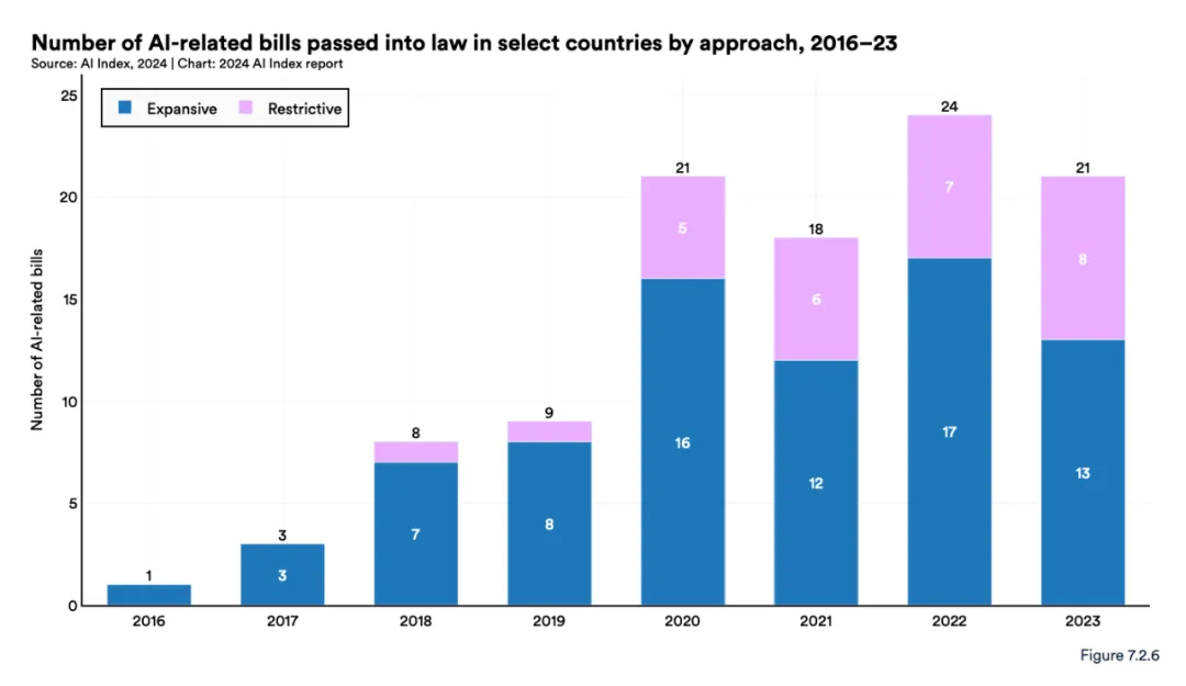 报告指出,在 2016 年至 2023 年期间,有 33 个国家至少通过了一项与人工智能有关的法律,其中大部分行动发生在美国和欧洲;在此期间,总共通过了 148 项与人工智能有关的法案。研究者还将法案分为旨在增强国家人工智能能力的扩张性法律和对人工智能应用和使用施加限制的限制性法律。