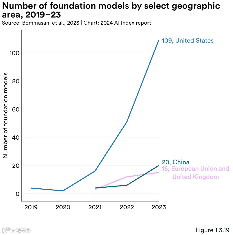 2023 年,全球大部分基础模型源自美国(109 个),其次是中国(20 个)和英国(图 1.3.18)。自 2019 年以来,美国在大多数基础模型的研发方面一直处于领先地位(图 1.3.19)。