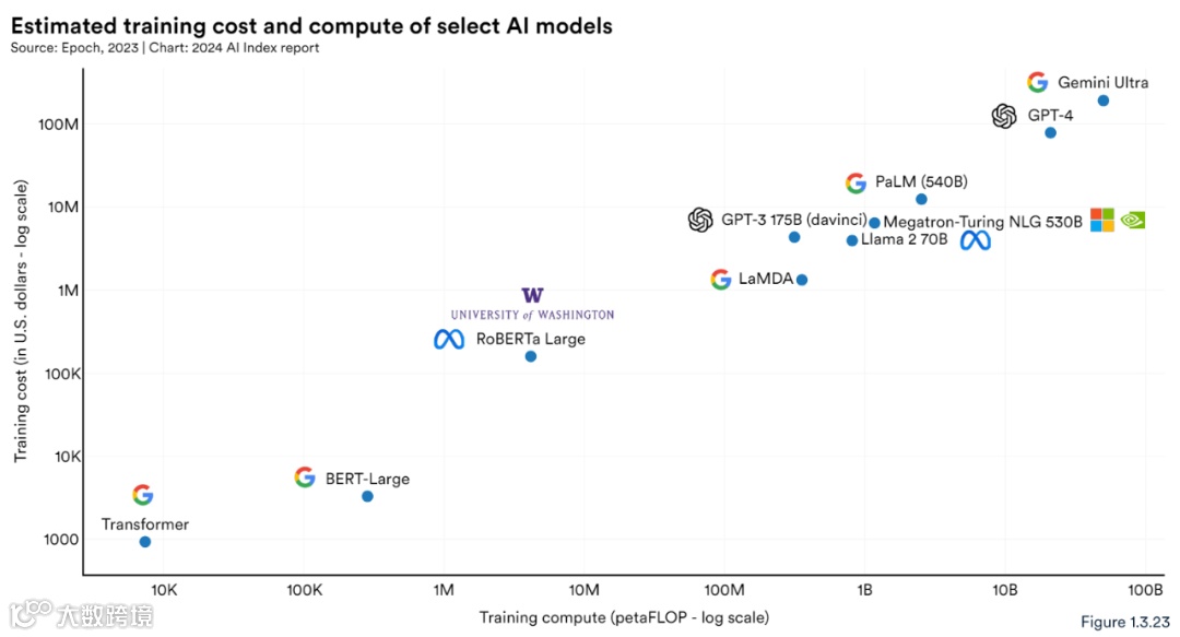 如图 1.3.23 所示,对计算训练需求更大的模型需要的训练成本更多。
