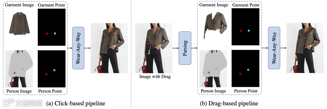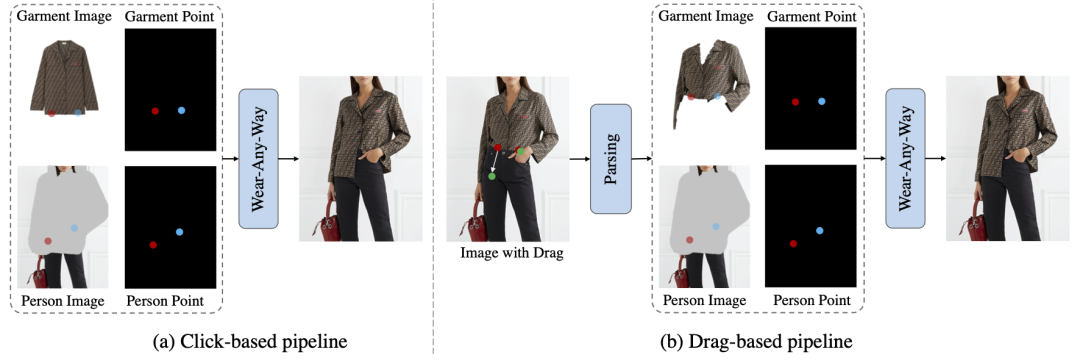 对于基于点击的控制,用户提供服装图像、人物图像和点对以定制生成结果。当用户拖动图像时,起始点和终点被分别视为服装图像和人物图像上的控制点,解析分割后的服装被视为服装图像输入。因此,拖动操作可以转换为基于点击的设置。