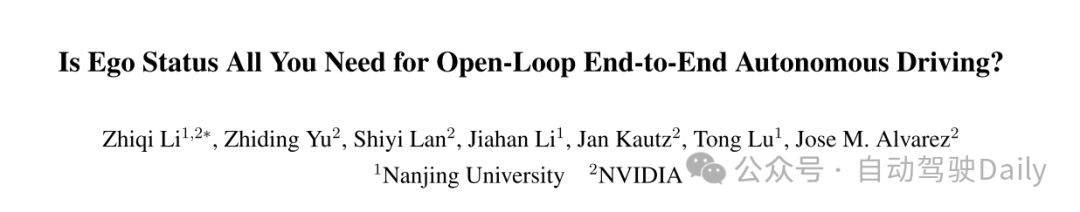 Li Z, Yu Z, Lan S, et al. Is Ego Status All You Need for Open-Loop End-to-End Autonomous Driving?[J]. arXiv preprint arXiv:2312.03031, 2023.