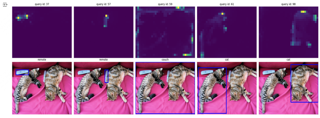 我们用同样的方法,取出decoder和encoder做cross-attention部分的attention weights,这样我们就能可视化出某个object query到底在关注图片中的什么部分,可视化结果如下: