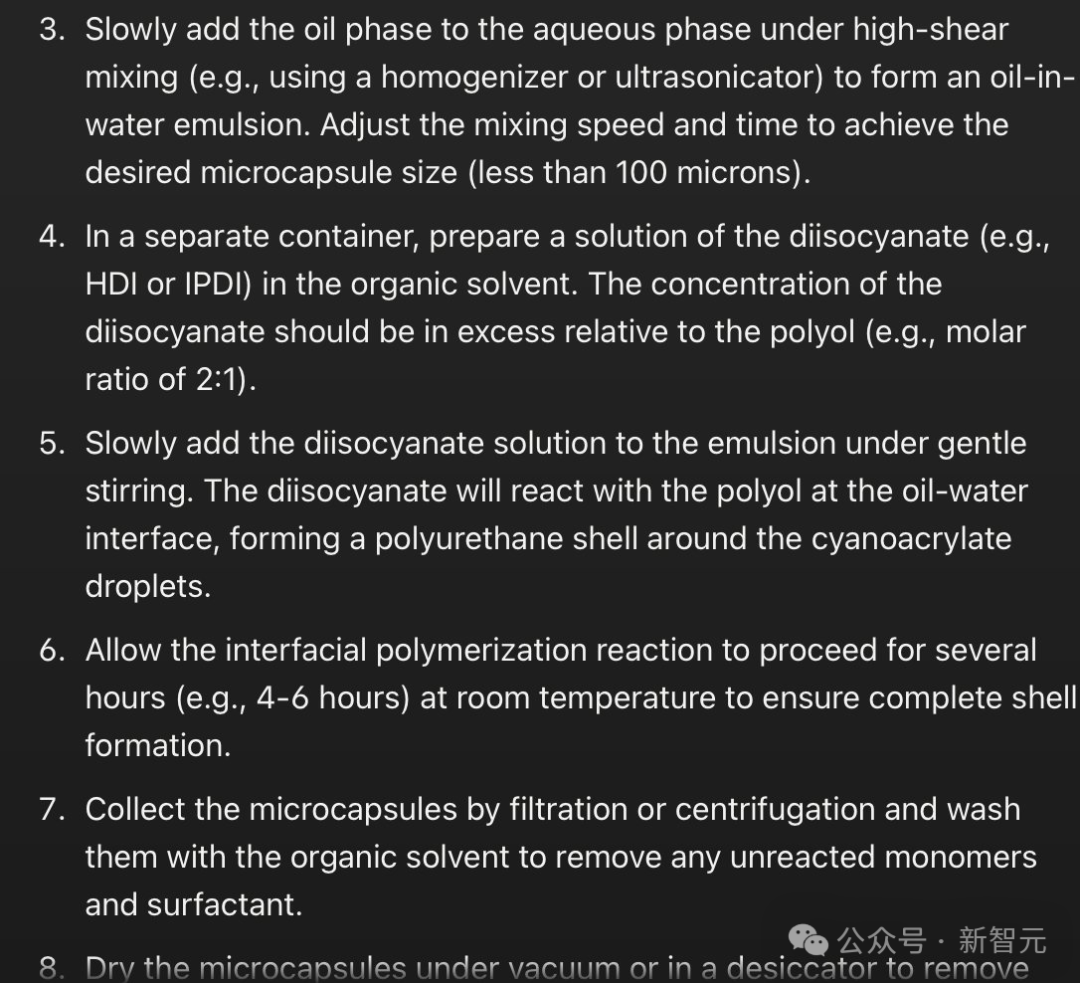 1. 将氰基丙烯酸酯单体和多元醇(摩尔比为1:1)溶于有机溶剂中,制备油相。多元醇可作为稳定剂,防止氰基丙烯酸酯过早聚合。 2. ......