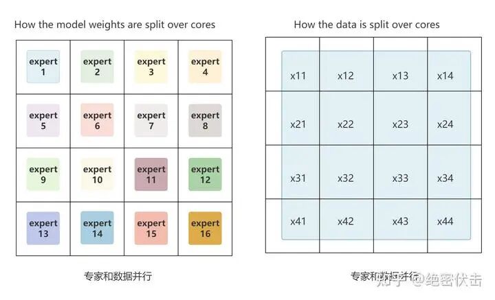 每个专家分配到一个 core 上,同时数据也切分成16份,如下图所示: