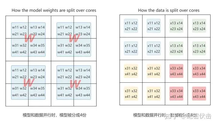 模型并行部分从模型侧看出来,16个 cores 维护的是一个整体的模型,但是每一个 core 只分配到其中部分模型参数(图4-6(a)),同一个 batch 数据在所有的 core 上计算(图4-6(b)),由于 1 个 core 中分布了不同的模型权重,每次计算完都需要和其他的 core 进行通信。
