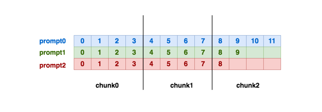 最后我们来看chunk2,这个chunk比较特殊,因为在这个chunk内,每一个prompt维护的序列长度是不一样的,3个prompt维护的tokens分别为[[8, 9, 10, 11], [8, 9], [8]]。