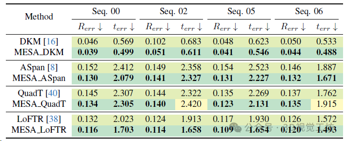 Visual Odometry: 在KITTI360数据集上,对比了MESA与四种点匹配方法在视觉里程计任务上的性能。主要评估了RPE等指标。结果表明,MESA能够明显提升所有基线的性能,与dense方法DKM的组合效果最佳。