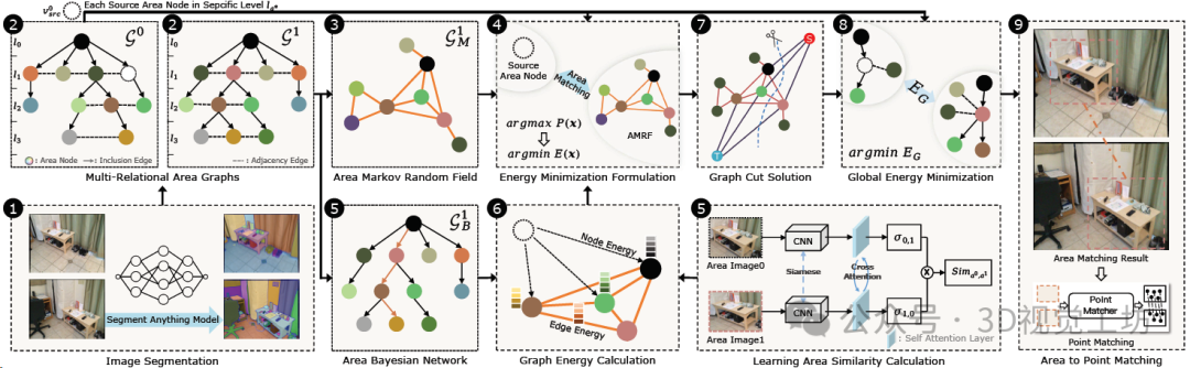 MESA概述:首先,从❶ SAM分割中构建❷区域图。然后,根据其两条不同类型的边,将图转换为两种图形模型。区域匹配通过❸区域马尔可夫随机场的形式化为能量最小化问题,并通过❼图切算法有效地解决。❻图能量计算的先决条件由❺区域贝叶斯网络和❺学习区域相似度计算高效地实现。最后,❽全局能量最小化确定最佳区域匹配,作为后续点匹配器的输入,遵循❾区域到点匹配框架,实现精确的特征匹配。