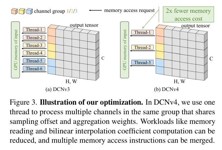 值得注意的是,每个组内的 个通道共享每个输出位置的相同的采样偏移量和聚合权重值。使用多个线程在同一输出位置处理这些 个通道是浪费的,因为不同的线程将从 GPU内存中多次读取相同的采样偏移量和聚合权重值,这对于内存受限的运算符至关重要。处理每个组内的多个通道 (每个输出位置) 在一个线程中,可以消除这些几余的内存读取请求,大大减少内存带宽使用。由于采样位置相同,作者也可以只计算DCN中使用的双线性插值系数一次。具体来说,如果每个线程处理 个通道,那么读取偏移量和聚合权重的内存访问成本以及计算双线性插值系数的计算成本都可以减少 倍。
